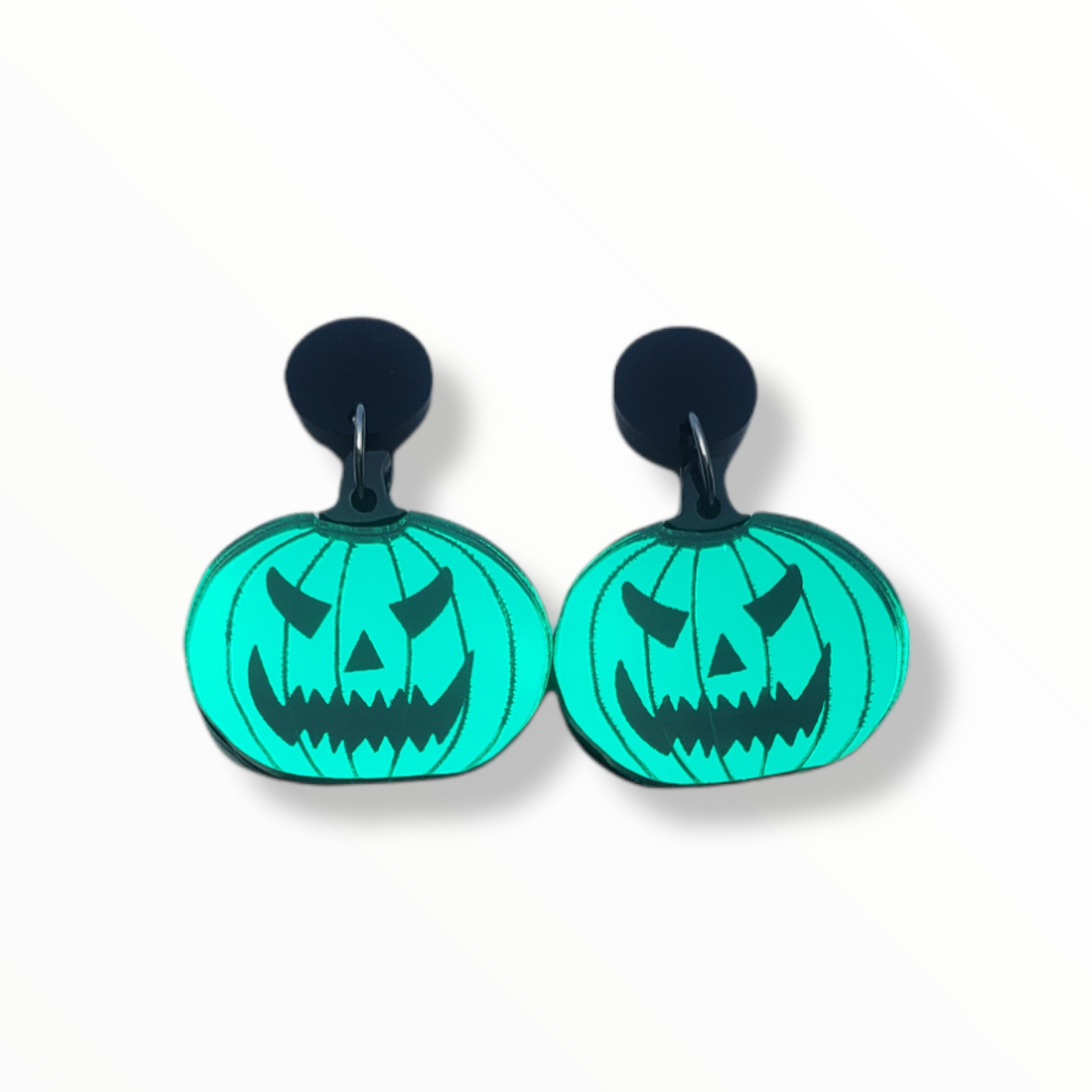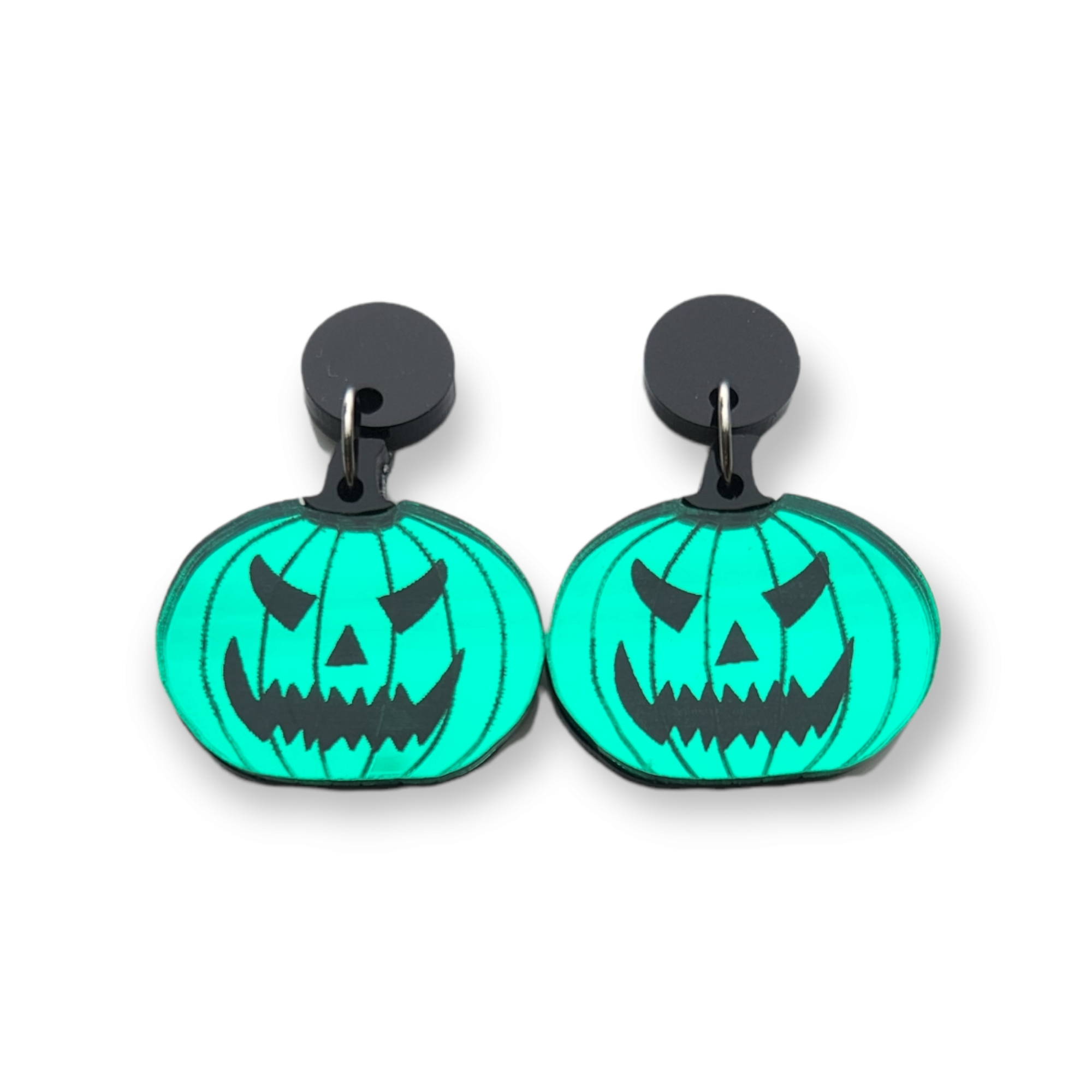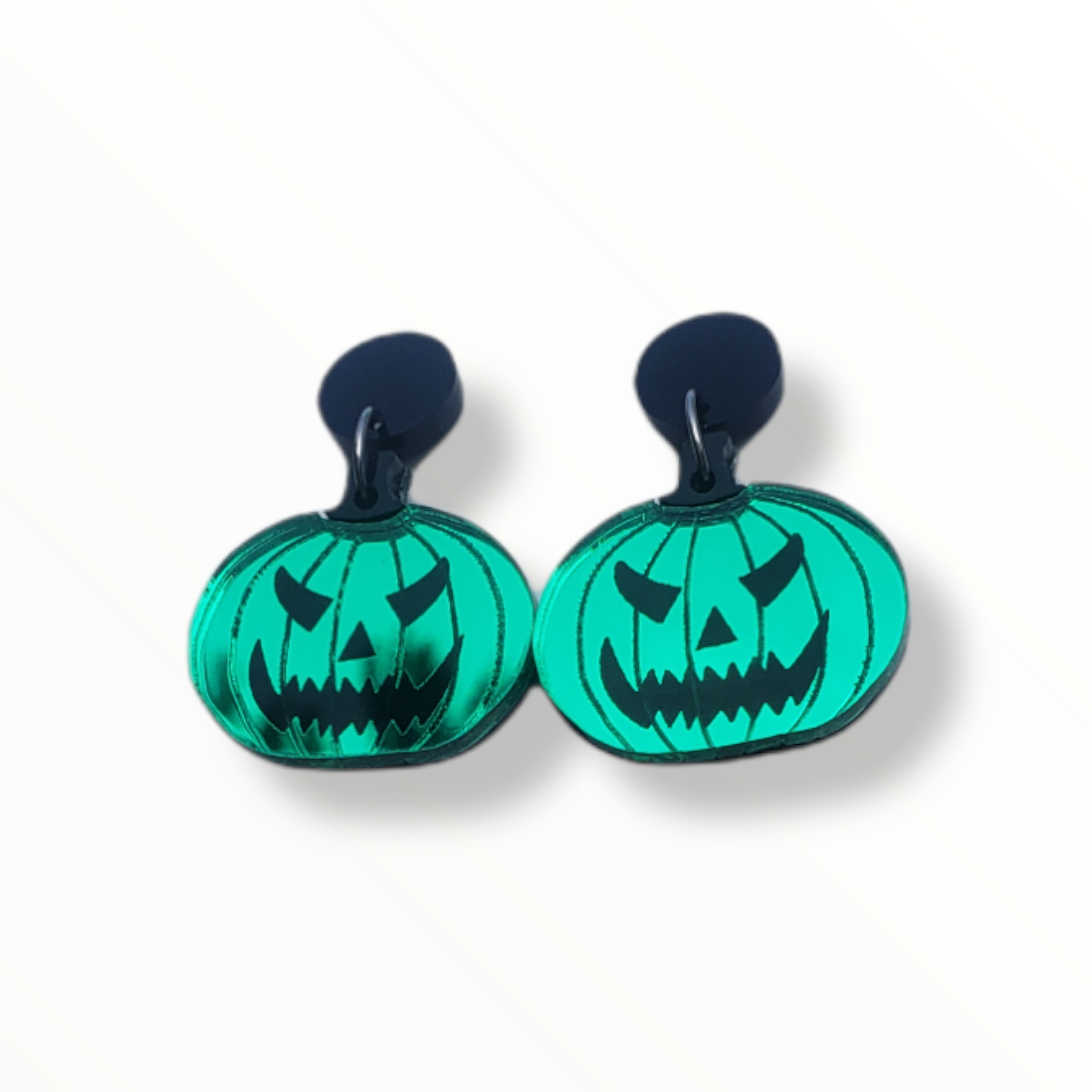 Happy Spooky Season! These angry pumpkins fit the bill for your spooky earring needs. They are green mirror with a black stem.