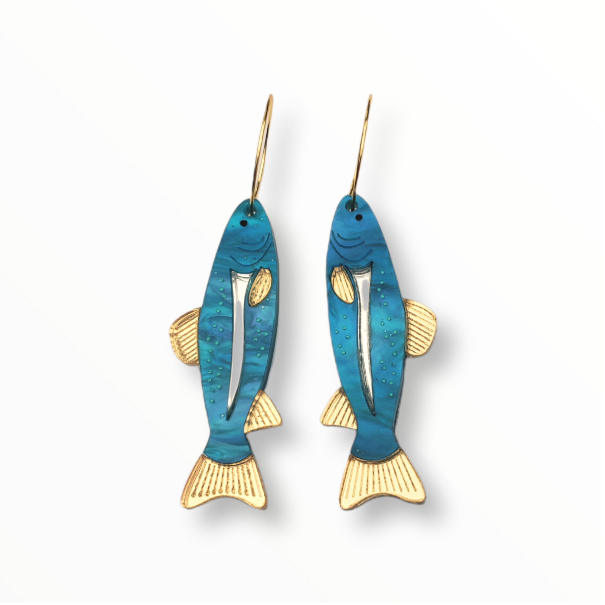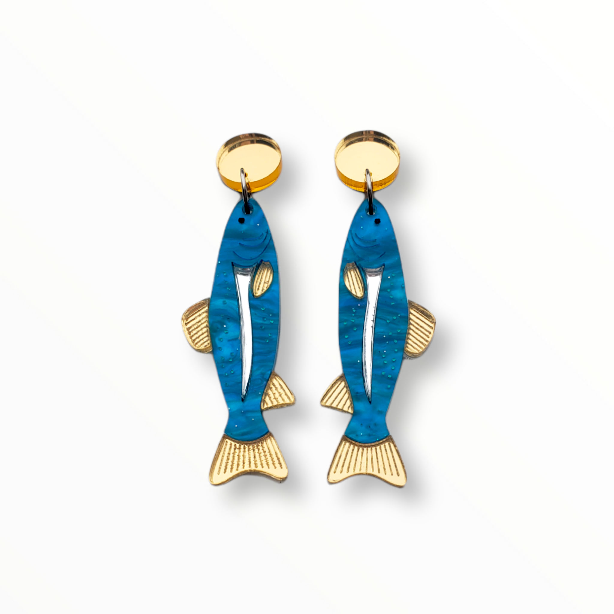 Fun and colorful blue trout earrings. These have a fun holographic sparkle scattered throughout .