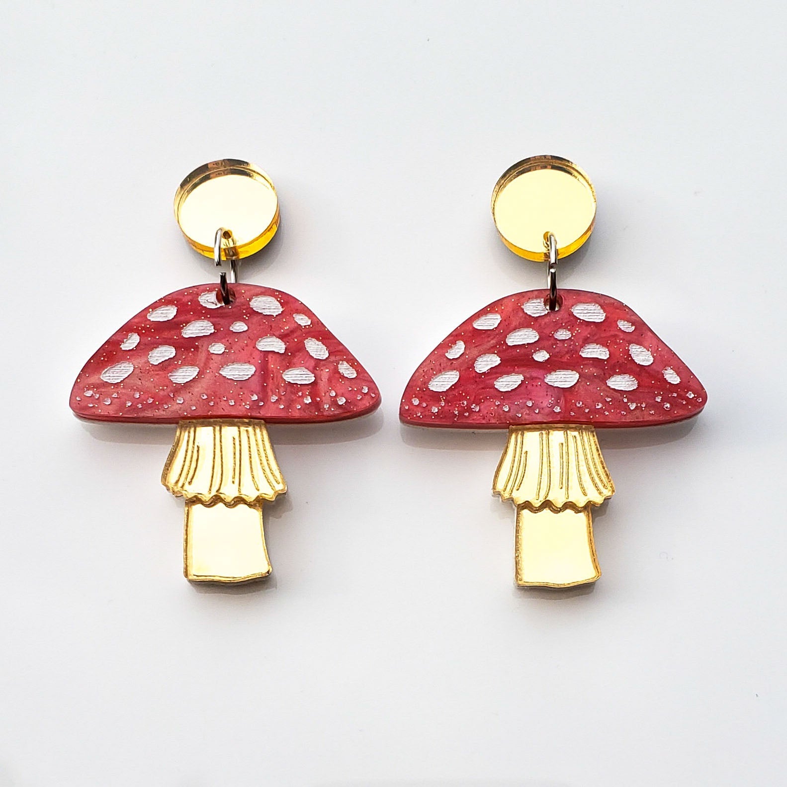 A classic red-capped toadstool. Gold mirrored stem with fun gold sparkles scattered throughout the red cap.